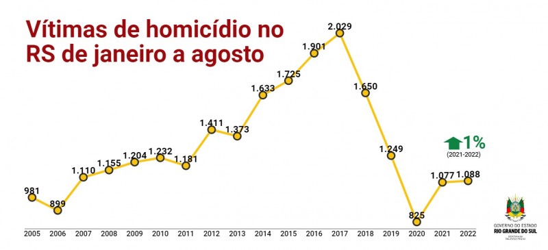 A Secretaria da Segurança Pública (SPP) divulgou os dados nessa sexta-feira (9), na página de estatísticas do seu site. Os indicadores criminais do RS referente a agosto consolidam o balanço dos oito primeiros meses de 2022.com 7,1% de aumento.