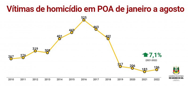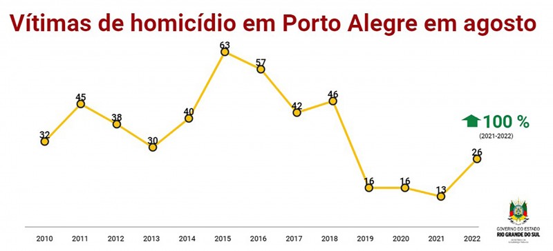 Em Porto Alegre, houve um aumento de homicídios em agosto. Subiram de 13 no ano passado para 26 neste ano, um aumento de 50%. No acumulado do ano, a capital gaúcha também registra alta nos assassinatos. O número subiu de 183 para 196, conforme os números divulgados pelo governo estadual.