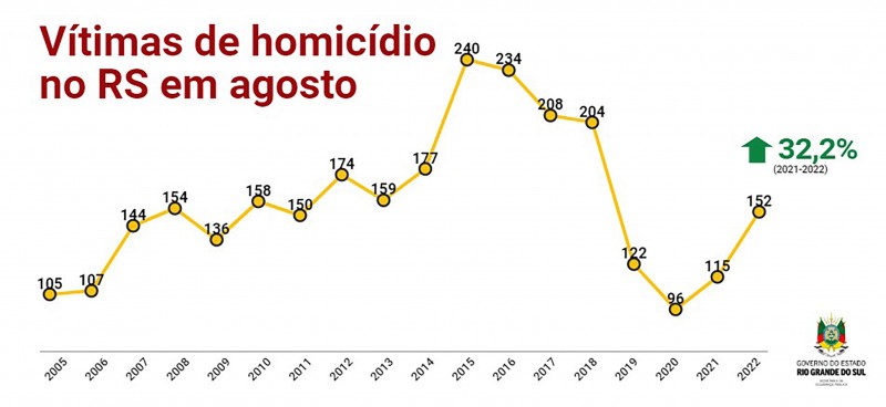 Somente no mês passado, 152 pessoas foram assassinadas no Estado, o que representa uma alta de 32,2% em relação a agosto de 2021, quando 115 gaúchos foram vítimas de homicídio.