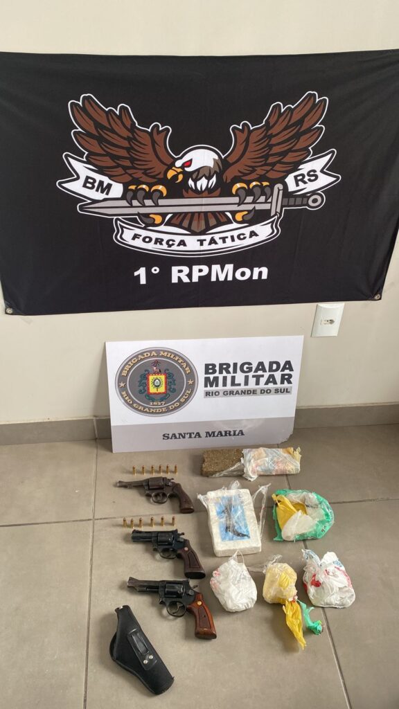 Na residência, os brigadianos do 1º Regimento de Polícia Montada (1º RPMon) apreenderam uma mochila com três revólveres calibre 38, munições, 872 gramas de maconha e 2,6 quilos de cocaína, além de roupas que foram usadas no assalto ao posto.