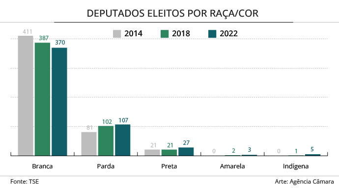 O número de deputados federais brancos também variou pouco, caindo 4,59% em 2022. Os autodeclarados brancos eram 387 em 2018 e somam 370 neste ano, mas permanecem a maioria entre os eleitos. Já os autodeclarados indígenas aumentaram de 1 para 5, e os amarelos eram 2 e agora são 3. Um deputado não declarou sua raça ao Tribunal Superior Eleitoral (TSE).