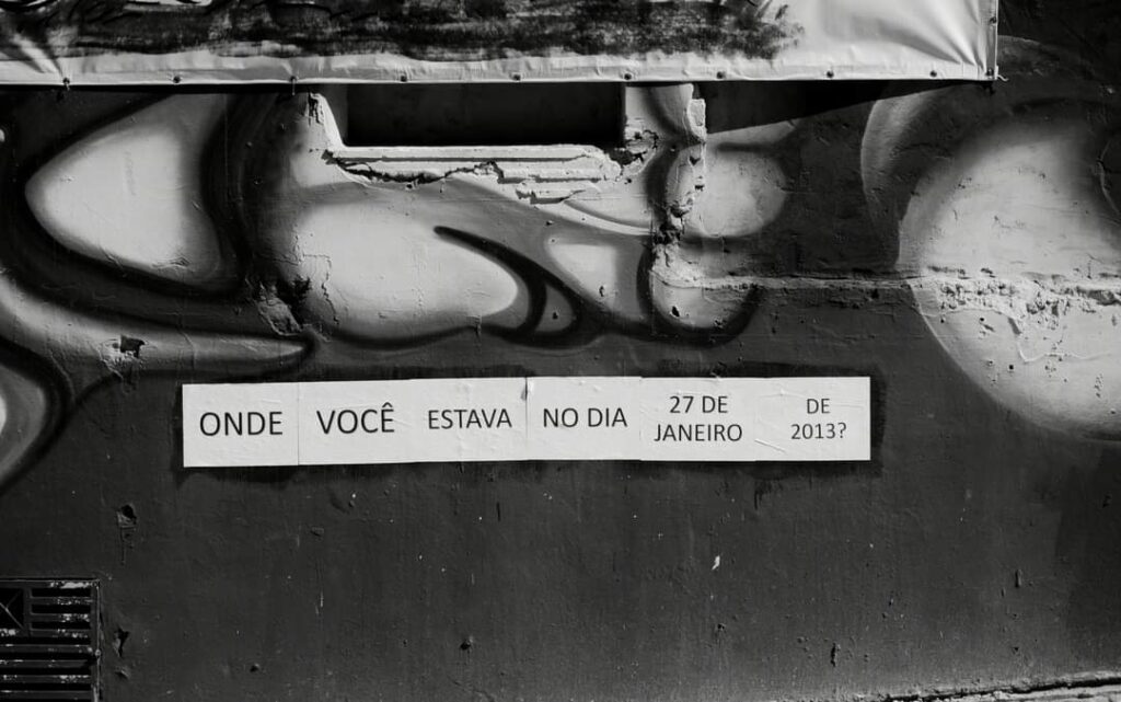 No último dia vinte e sete de outubro (27/10), aconteceu a Intervenção “Onde você esta(va)?”, em que foram realizadas colagens em lambe da pergunta “Onde você estava no dia 27 de janeiro de 2013?”.