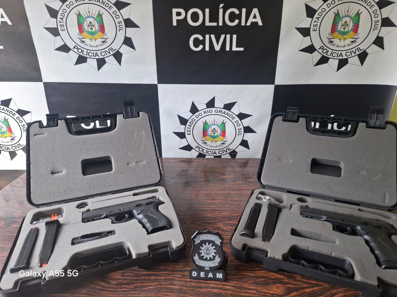 A Delegacia Especializada no Atendimento à Mulher (DEAM) de Santa Maria, em consonância com a Operação Carnaval Seguro, cumpriu diversas ordens judiciais de mandado de busca e apreensão. A ação resultou na apreensão de duas pistolas calibre .380.